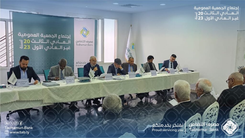 يسر مجلس إدارة مصرف التضامن دعوة السيدات والسادة المساهمين برأس المال لحضور إجتماع الجمعية العمومية العادية الأول لسنة 2024 والمقرر عقدها على تمام الساعة العاشرة صباحاً من يوم الأربعاء الموافق : 29-05-2024 م ، وذلك بقاعة الإجتماعات بمقر فرع حي الأندلس سابقاً – الكائن بعمارة شركة التكافل للتأمين بمدينة طرابلس ، لمناقشة جدول الأعمال التالي :